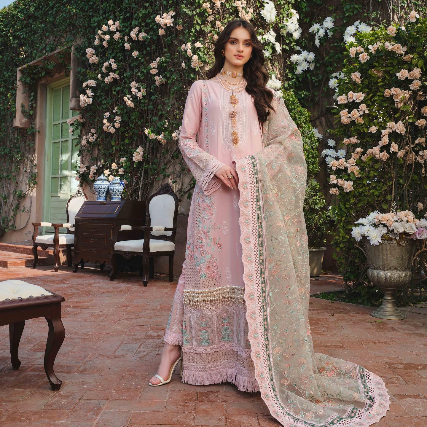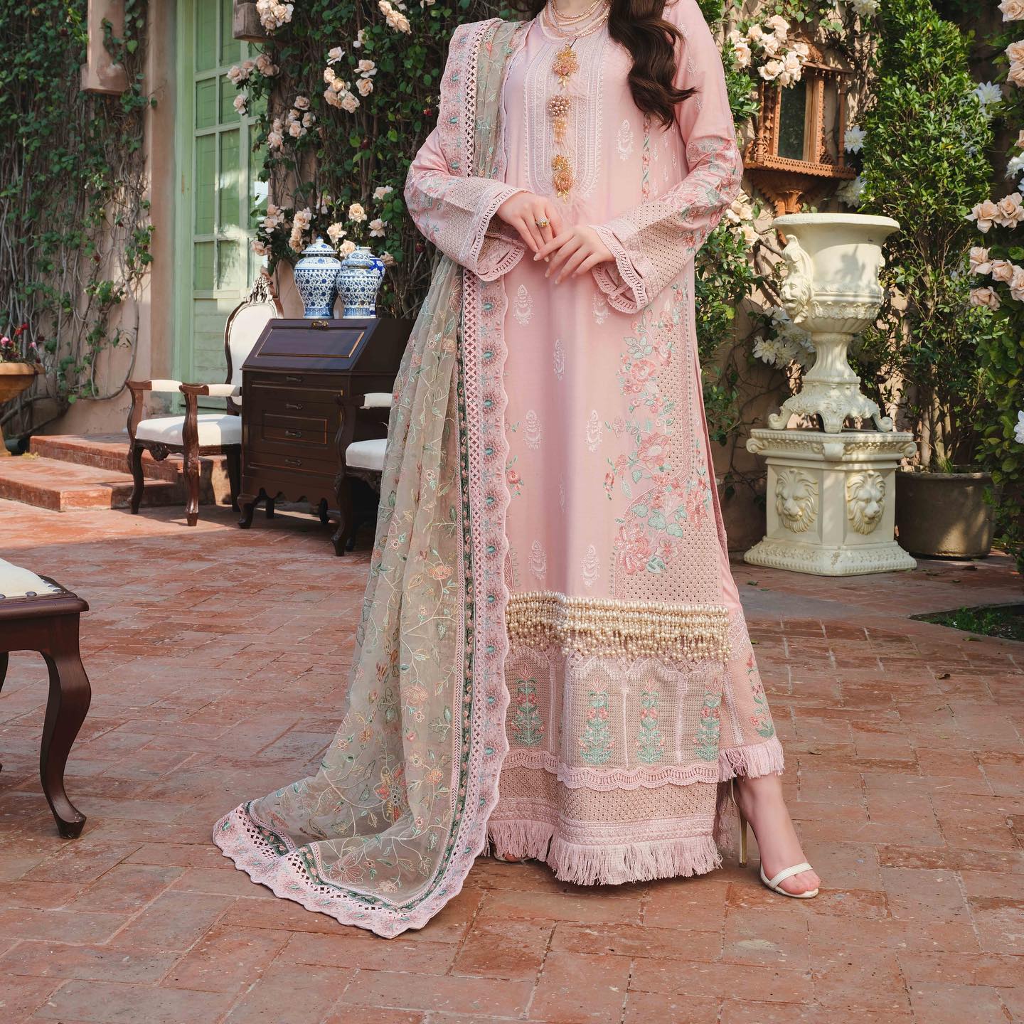 Embroidered organza dupatta with embroidered lawn Patti patch
